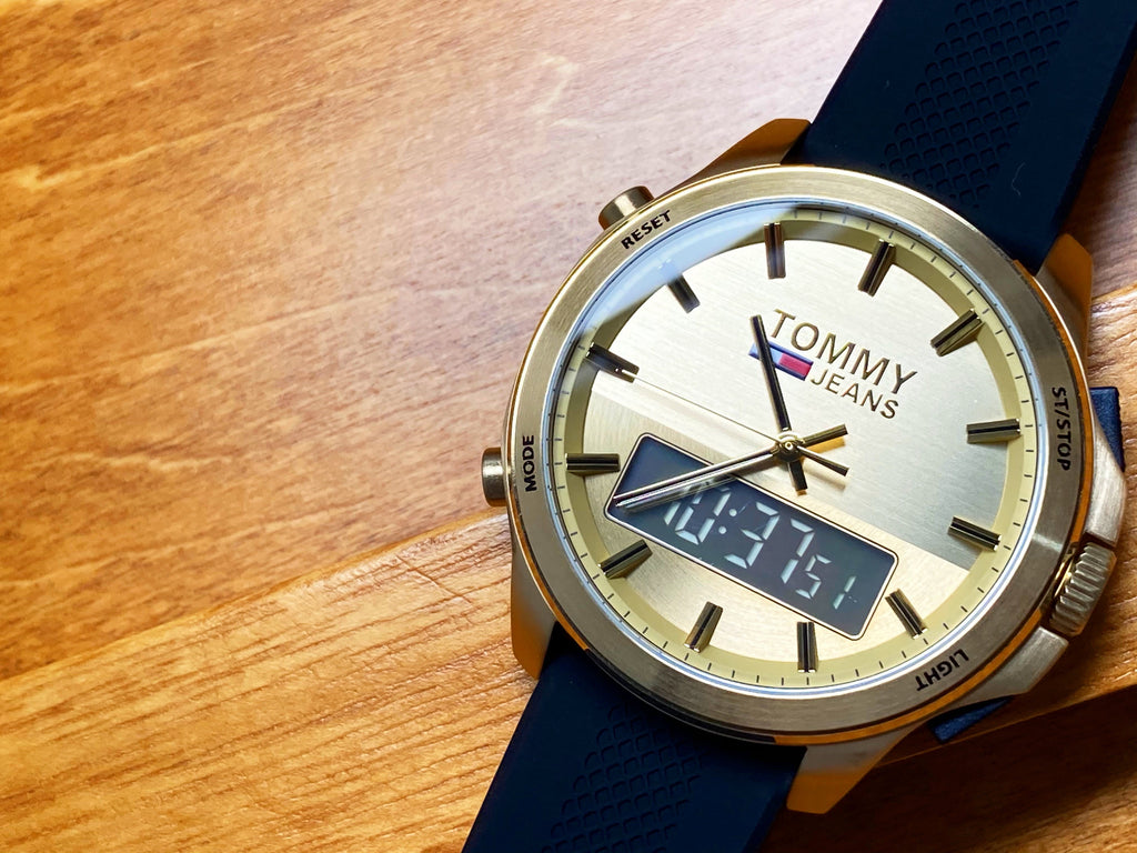 Tommy Hilfiger Jeans Digital Analog Gold Dial Black Rubber Strap Watch For Women - 1791762
