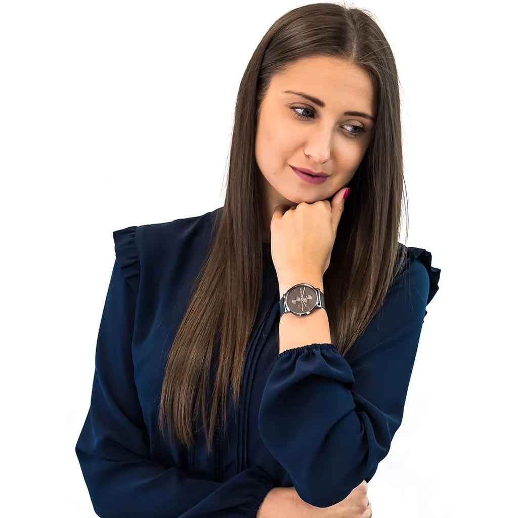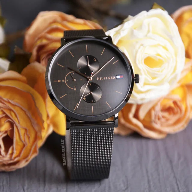 The Tommy Hilfiger 1781945 women's watch is a classic, tasteful women's timepiece. The watch has a stainless steel case and bracelet with a graphite-colored coating. The graphite dial protected by mineral glass has subdials indicating the day of the month, day of the week and daily time.