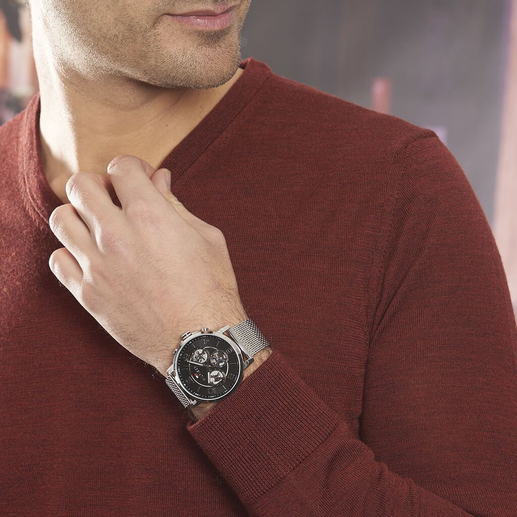 Tommy Hilfiger Chronograph Black Dial Silver Mesh Bracelet Watch for Men - 1791292
