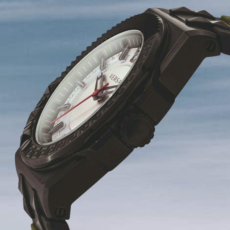 The Versace VEDY00419 Chain Reaction has a particularly tough look. This is due to the black PVD watch case but certainly also to the green watch strap made of silicone. The Versace VEDY00419 is equipped with a reliable Swiss movement that displays the time very accurately.