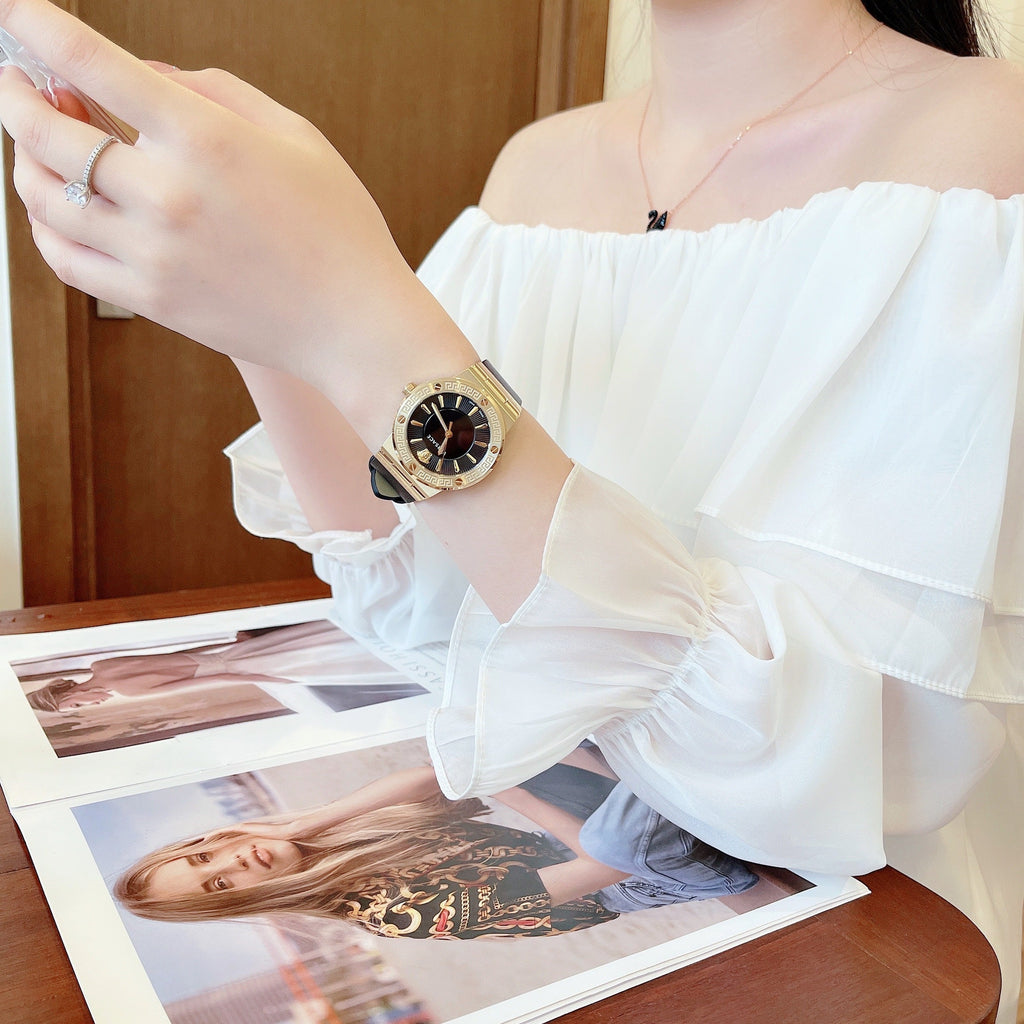 Black Dial with IP Gold Plated Stainless Steel Hour, Minute, and Seconds Hand and Baton Indexes.