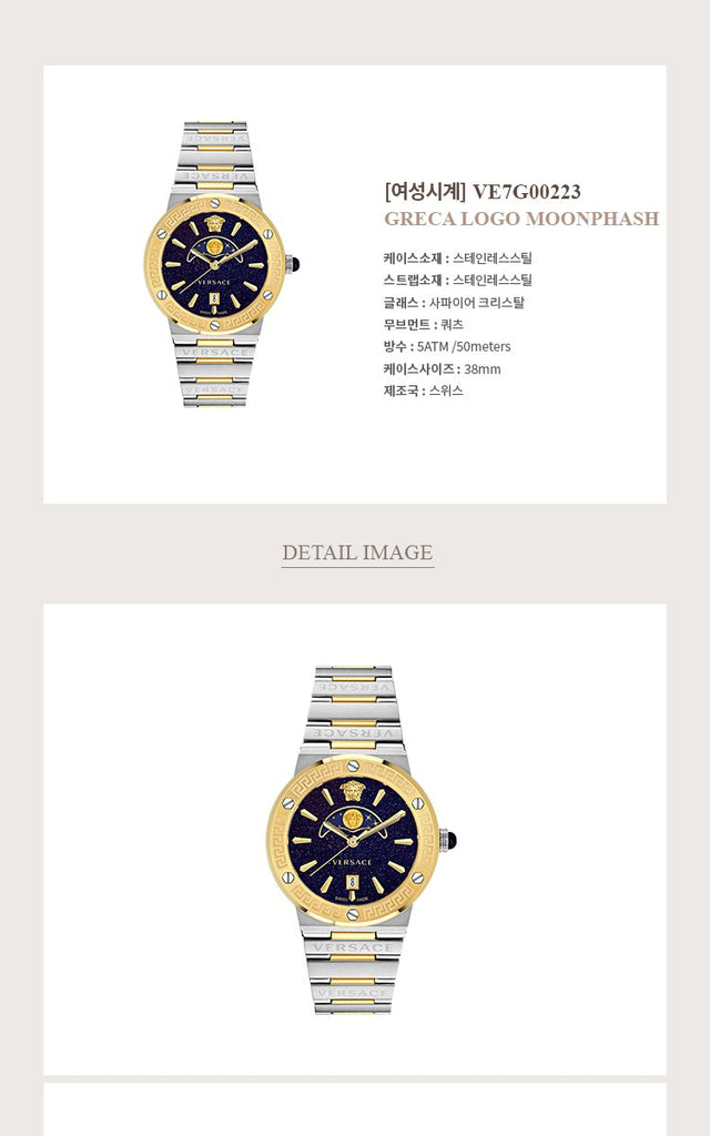 The moonphase window is visible in the upper part of the dial, featuring all the phase of the moon in a very elegant and chic way. In the bracelet version, the timepiece's sleek design is completed by the Versace logo alternately repeated on the links.