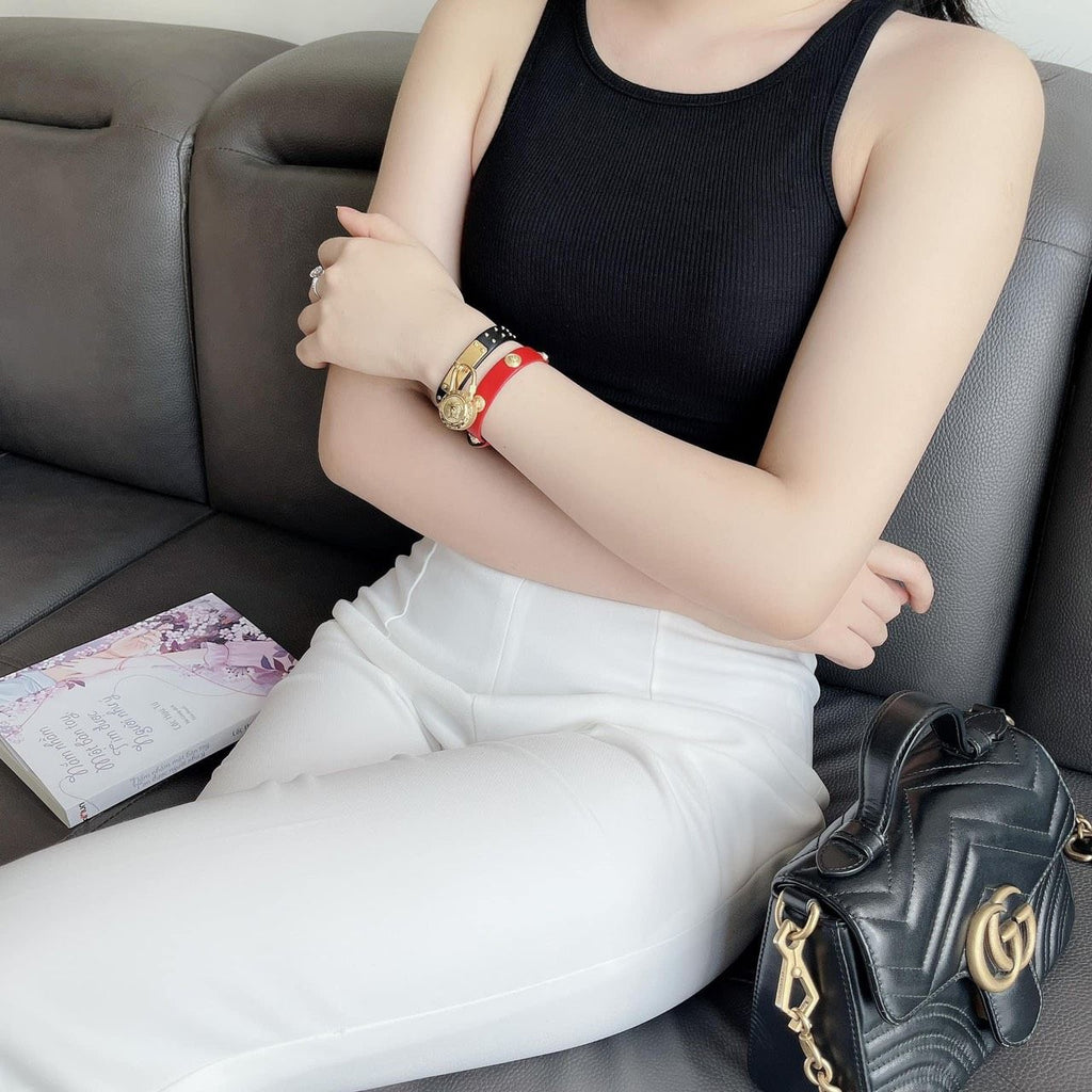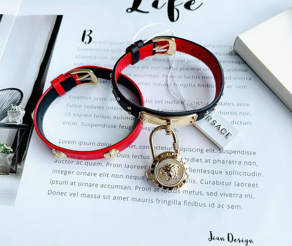 A charming and innovative timepiece, the Medusa Lock Icon watch is enriched with the iconic Greca on the top ring and on the padlock. The golden dial features the Versace logo at 12h. Striking 3D Medusa studs stand out, characterizing the watch straps. One by one, they embellish the long double tour strap in a red and black tone.