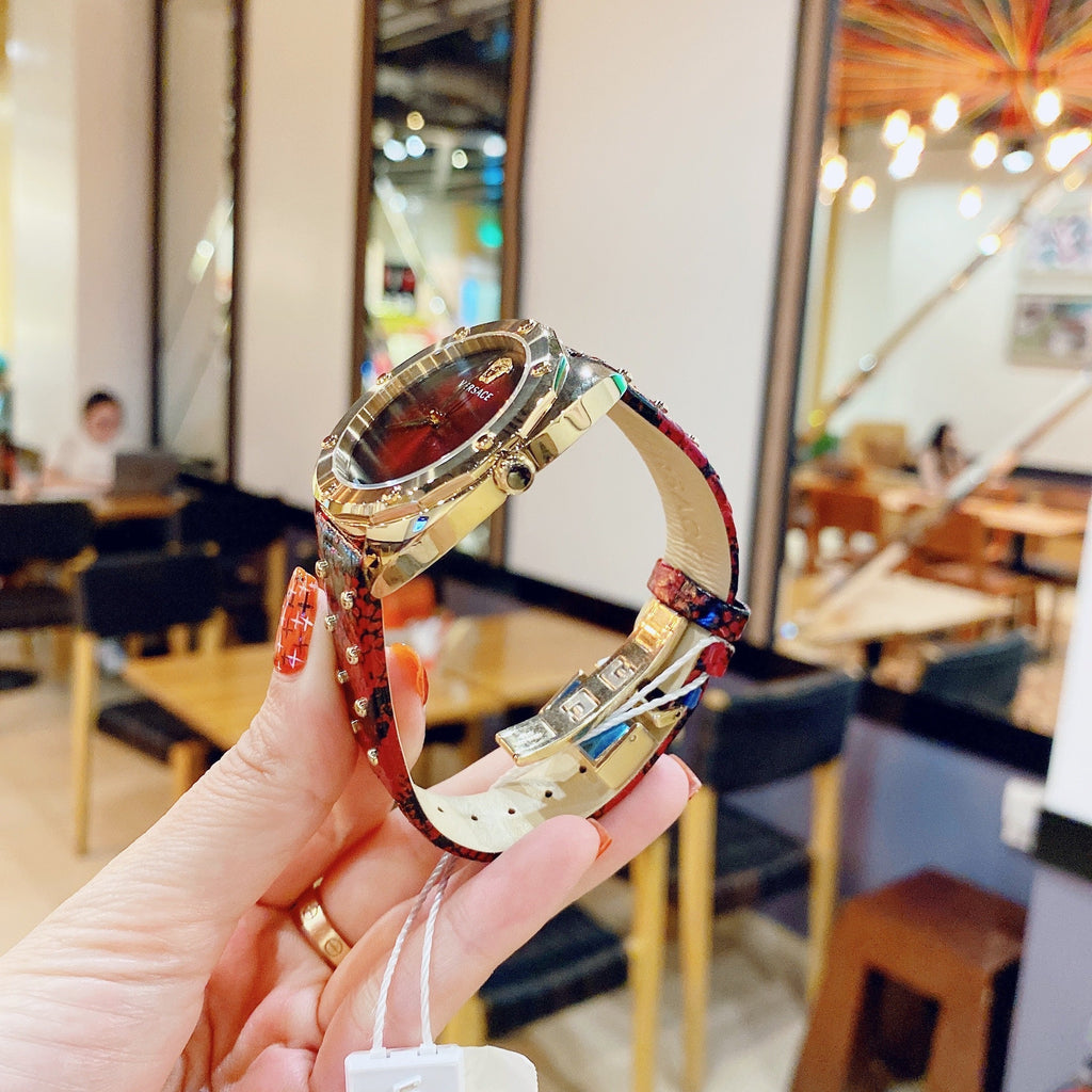 Bring a new dimension to your wrist with this women's analog watch from Versace. The red round dial exudes plain three hands, Medusa at the 12th-hour position and a crown for time adjustment. The stainless steel strap vaunts a red hue that enhances the look of the watch. Product Warranty - does not cover damage caused by accidents, improper use, theft, loss of the watch. Also excluded from the warranty are the strap or bracelet, the battery and the crystal.