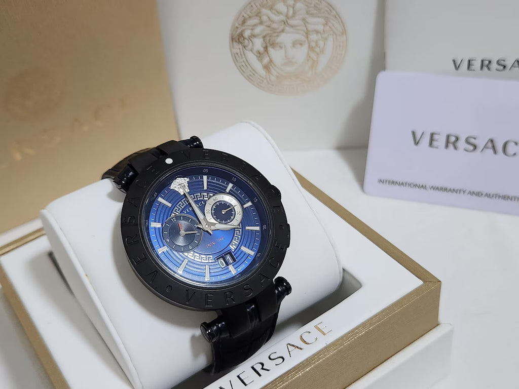 Versace V Race Chronograph Quartz Blue Dial Blue Leather Strap Watch For Men - VEBV00419