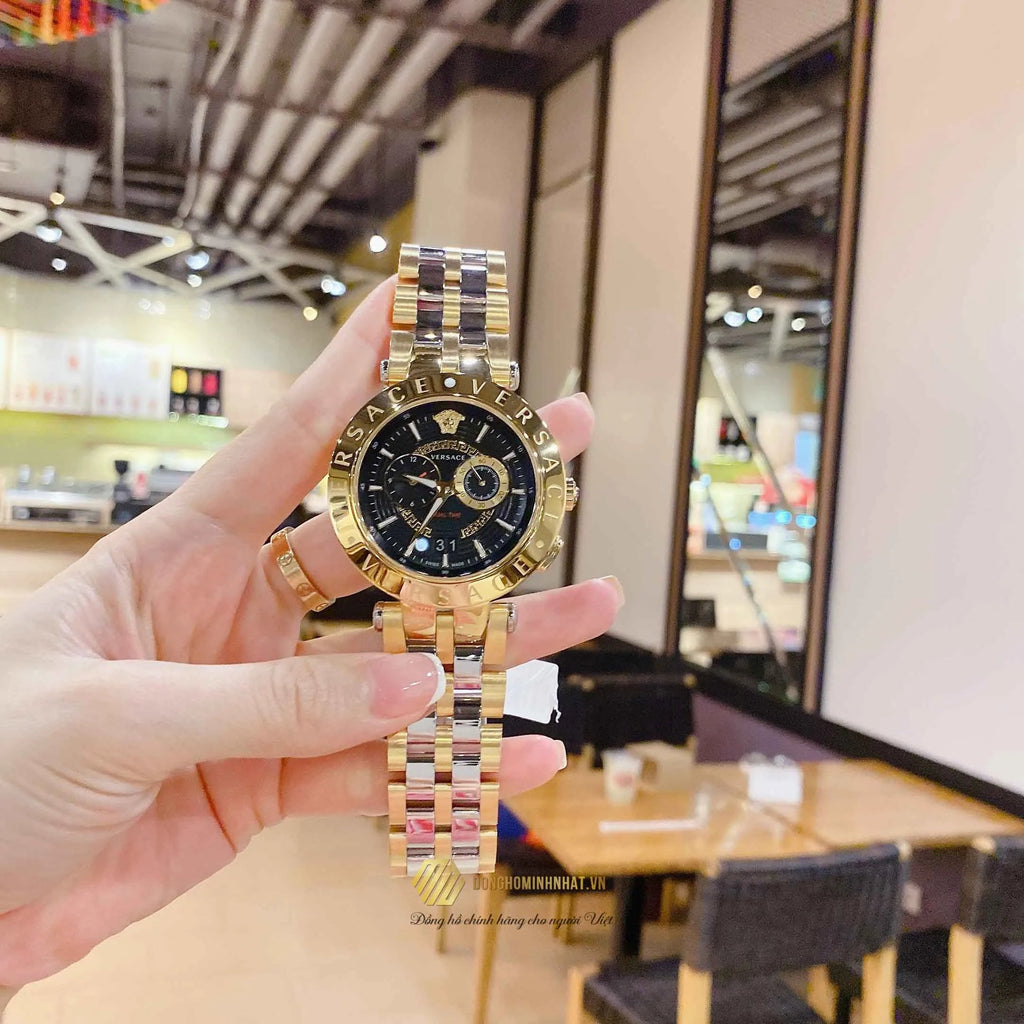 Gold ion-plated stainless steel case with a two-tone (silver and gold) stainless steel link bracelet bracelet. Fixed gold ion-plated stainless steel bezel. Black sunray (greca logo) dial with luminous gold-tone hands and index hour markers. Minute markers. Arabic numeral minute markers (at 5 minute intervals). Medusa head logo appears at the 12 o'clock position.