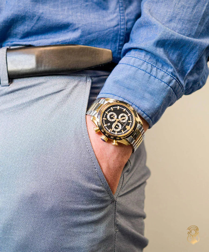 The Versace VE2I00421 V-Ray chronograph is a stunning men's watch. The bezel showing the tachymeter is very cool and gives this Versace V-Ray a tough look. Of course, a quartz watch of this quality is equipped with a Swiss movement and sapphire crystal. A chronograph and date display are not missing. Waterproof the VE2I00421 is too, you can take it in the shower but you can't go swimming with it.