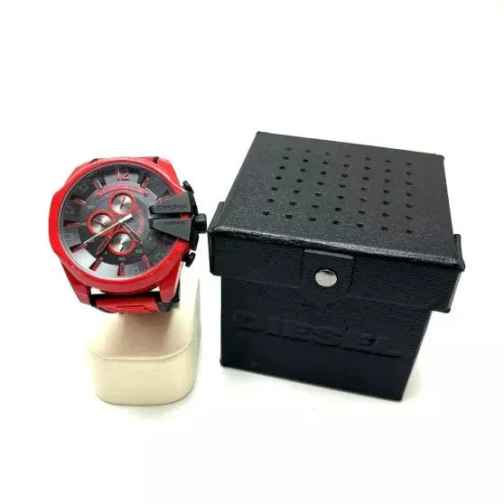 Diesel Mega Chief Chronograph Quartz DZ4526 100M Men’s Watch This Diesel Mega Chief Chronograph watch exerts power with style and any highly active person should get one. It showcases an insane shade of bold, matte red; detailed and finely crafted. The stainless steel case and red logo-pressed silicon strap rounds (in its literary sense) up the look. A watch perfect for any casual event with a lot of activities happening.