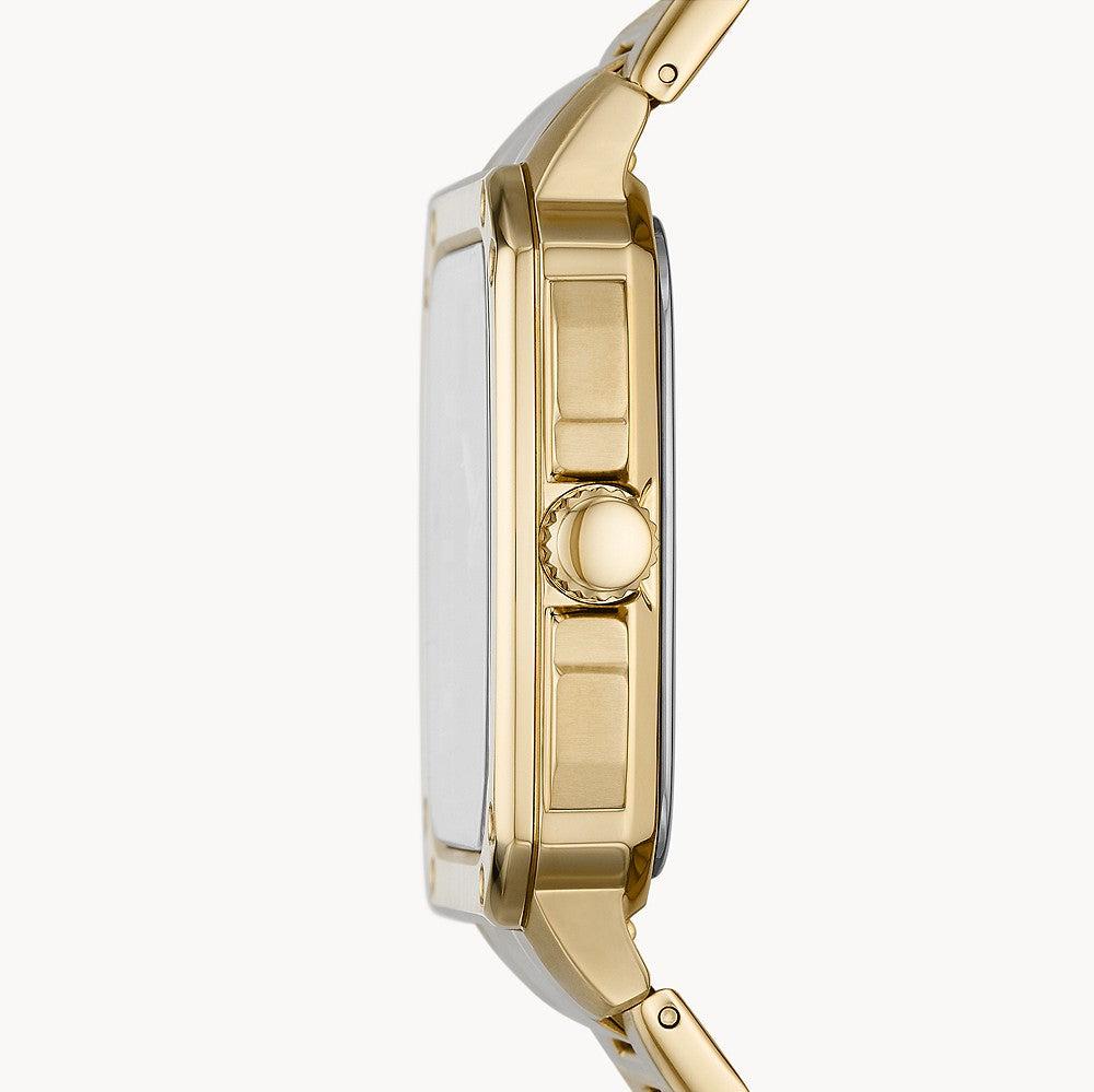 - Gold-tone plated stainless steel bracelet with bracelet deployant closure; interchangeable with Fossil 22mm watch straps