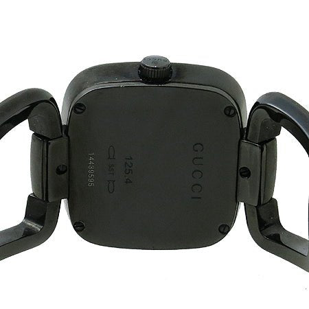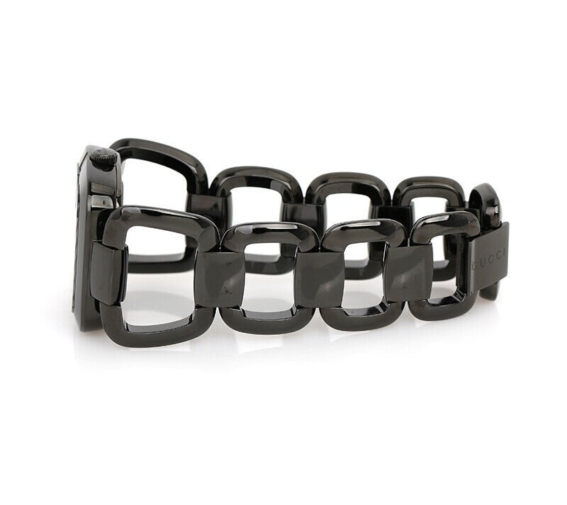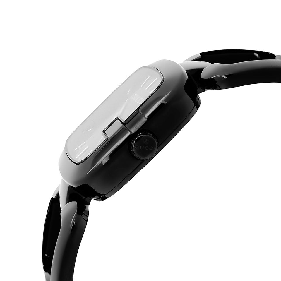 Black PVD stainless steel case and bracelet. Fixed black ion-plated G-shaped bezel. Sun-brushed black dial with silver tone hands and stick hour markers. Dial Type: Analog. Quartz movement. Scratch resistant sapphire crystal. Case diameter: 30 mm. Rectangle case shape. Jewelry clasp. Water resistant at 30 meters (100 feet). Functions: hours, minutes, seconds. Fashion watch style. Watch label: Swiss Made. Gucci 125 G-Gucci Series Bracelet Watch YA125403.