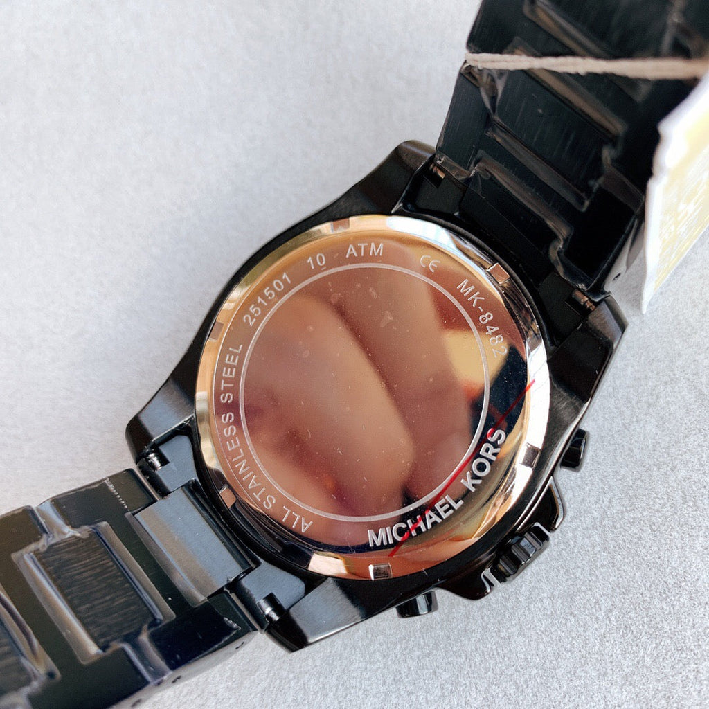 Solid case back. Case size: 44 mm. Case thickness: 12 mm. Round case shape. Band width: 24 mm. Deployment clasp with a push button release. Water resistant at 100 meters / 330 feet. Functions: chronograph, date, hour, minute, second. Additional Info: in general, suitable for swimming and snorkeling, but not diving. Dress watch style. Michael Kors Brecken Chronograph Men's Watch MK8482.