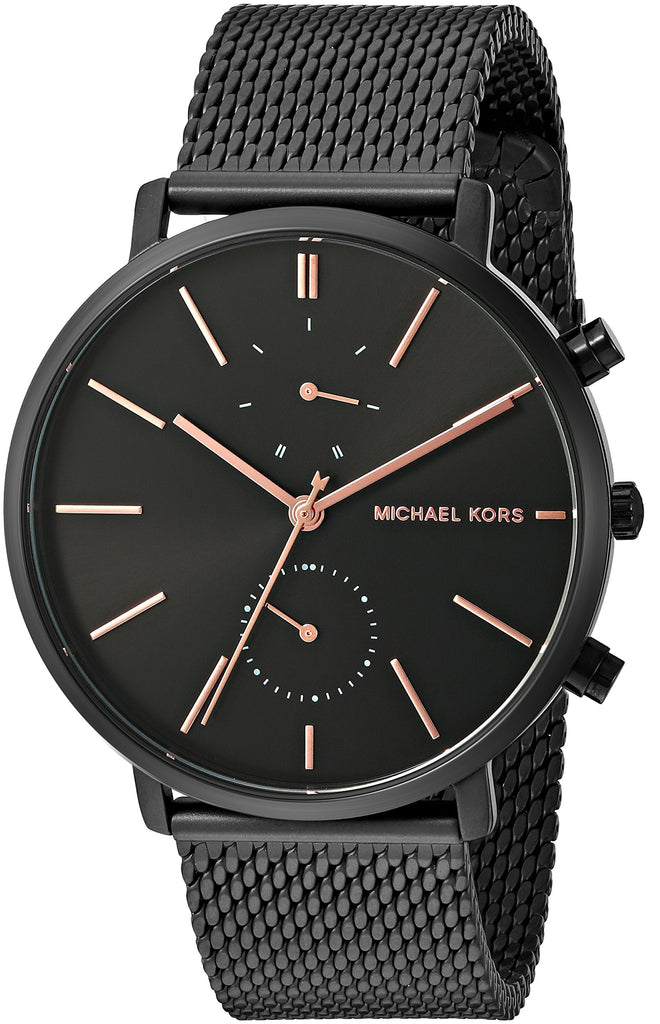 Make a strong style statement in the Michael Kors Jaryn watch. A polished black IP case and fluid mesh bracelet perfectly complement the black sunray dial with minimalist rose gold-tone stick indexes and sub dials.