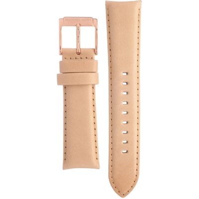 Black ion-plated stainless steel case with a beige leather strap. Fixed black ion-plated bezel showing tachymeter markings. Black dial with luminous rose gold-tone hands and index hour markers. Minute markers around the outer rim. Dial Type: Analog. Luminescent hands and markers. Chronograph - four sub-dials displaying: 60 seconds, 60 minutes, 24 hours, and 1/20th of a second. Quartz movement. Scratch resistant mineral crystal. Solid case back. Case size: 43 mm.