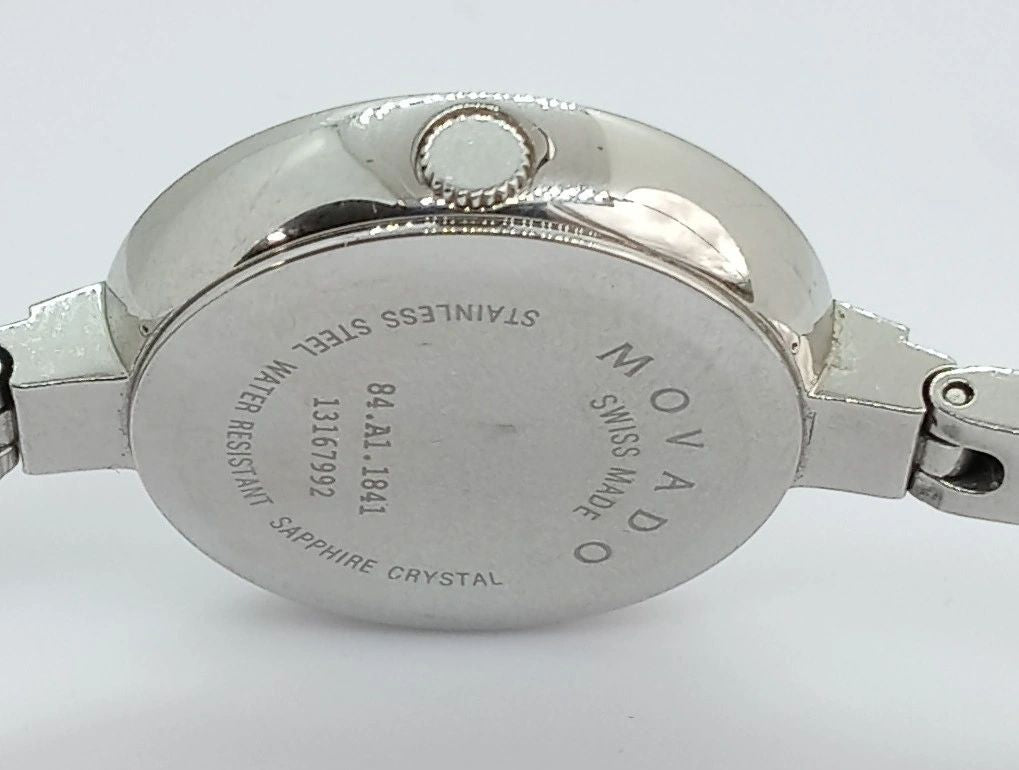 Silver-tone stainless steel case with a silver-tone stainless steel bangle bracelet. Fixed silver-tone stainless steel bezel. Black museum dial with silver-tone dauphine-style shape hands. Movado dot marks the 12 o’clock position. Dial Type: Analog. Quartz movement. Scratch resistant sapphire crystal. Pull / push crown. Solid case back. Round case shape, case size: 25 mm, case thickness: 6 mm. Band width: 5 mm, band length: 6 inches. Jewelry clasp. Water resistant at 30 meters / 100 feet. Functions: hour, minute. Dress watch style. Watch label: Swiss Made. Movado Bela Black Dial Stainless Steel Bangle Ladies Watch 0606595.