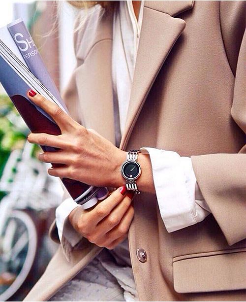 Stainless steel case with a stainless steel bracelet. Fixed stainless steel bezel set with diamonds. Matte black dial with silver-tone hands. No markers. The Movado dot marks the 12 o’clock position. Dial Type: Analog. Quartz movement. Scratch resistant K1 mineral crystal. Push / pull crown. Solid case back. Case size: 28 mm. Case thickness: 6 mm. Round case shape. Band width: 14 mm. Deployment clasp with a push button release. Water resistant at 30 meters / 100 feet. Functions: hour, minute. Additional Info: in general, withstands splashes or brief immersion in water, but not suitable for swimming or bathing. Casual watch style. Watch label: Swiss Made. Movado Esperanza Matte Black Stainless Steel Ladies Watch 0607052.