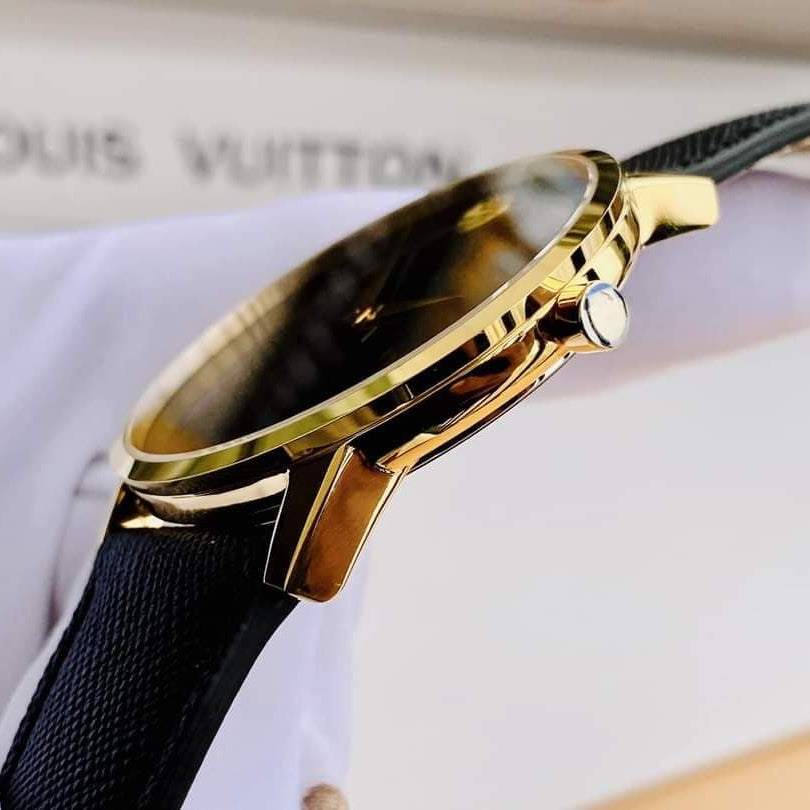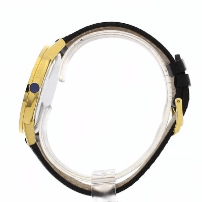 Black dial. Yellow Gold PVD stainless steel case with a black leather band. Quartz movement. 30 meters / 100 feet water resistance. Fixed bezel. Tang clasp. Case size 40 mm x 6.3 mm. Movado 0607195 Museum Watch.