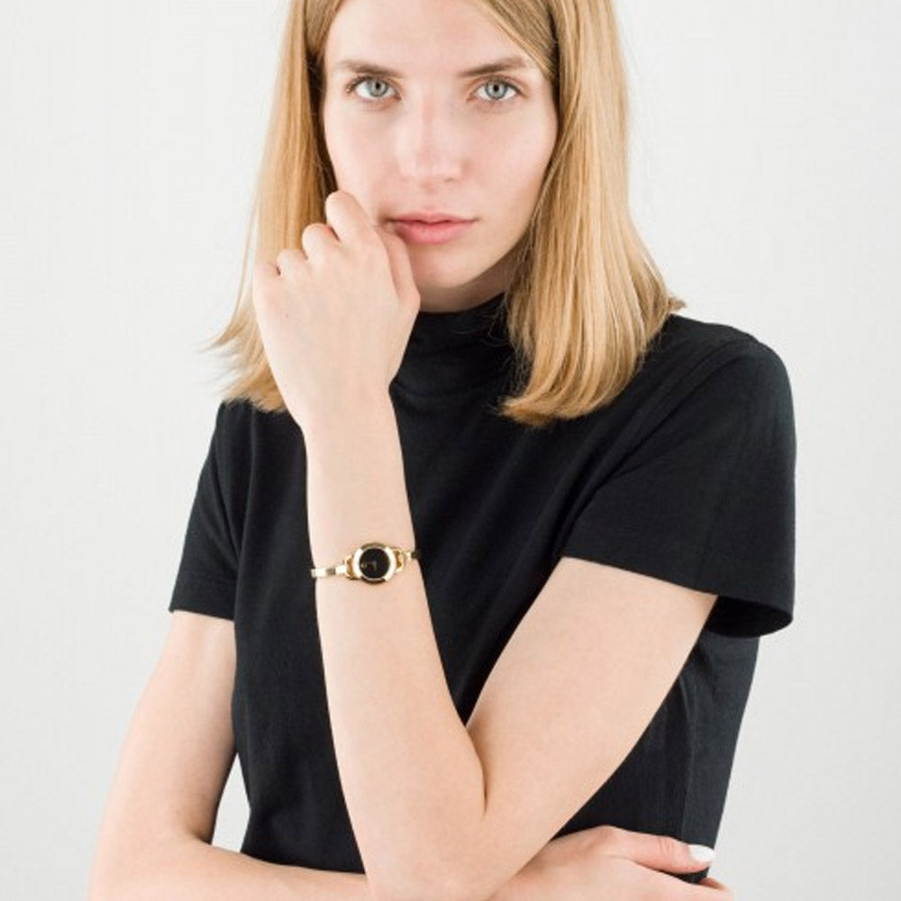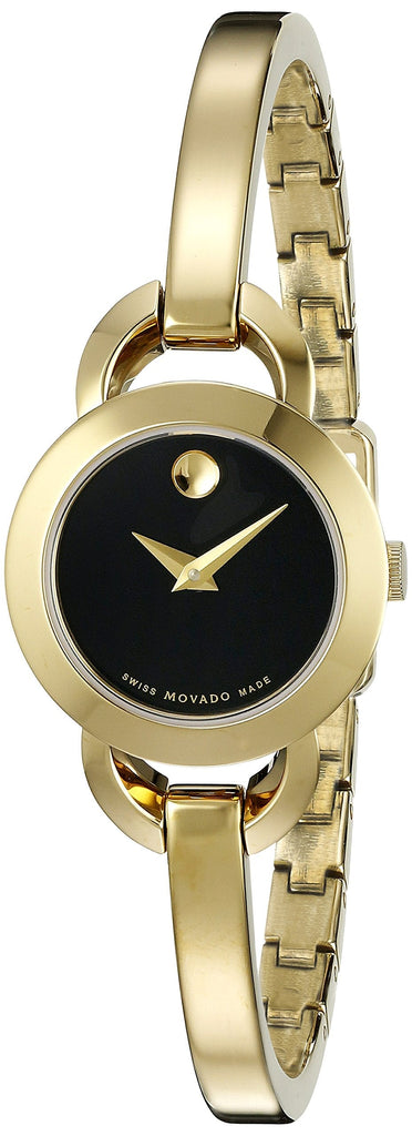 Yellow gold PVD stainless steel case and bracelet. Fixed yellow gold PVD bezel. Black dial with gold-tone hands. No markers. The Movado dot appears at the 12 o'clock position. Dial Type: Analog. Quartz movement. Scratch resistant sapphire crystal. Pull / push crown. Solid case back. Case diameter: 22 mm. Case thickness: 7 mm. Round case shape. Jewelry clasp. Water resistant at 30 meters / 100 feet. Functions: hour, minute. Dress watch style. Watch label: Swiss Made. Movado Rondiro Black Dial Yellow Gold PVD Ladies Watch 0606888.
