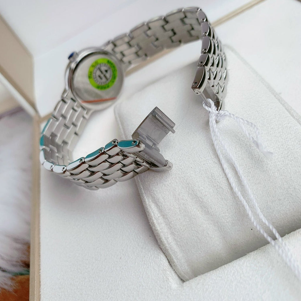 Pull / push crown. Solid case back. Round case shape, case size: 28 mm, case thickness: 6 mm. Band width: 14 mm, band length: 7 inches. Deployment clasp. Water resistant at 30 meters / 100 feet. Functions: hour, minute. Dress watch style. Watch label: Swiss Made. Movado Black Dial Stainless Steel Ladies Watch 0606338.