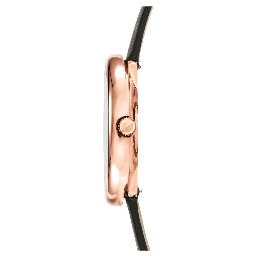 Enhance any outfit with this pure, feminine, and modern timepiece with a luxurious sparkle. The rose gold-tone coated stainless steel case is filled with around 850 black crystals, set in our unique Crystalline technique. The black sunray dial harmonizes perfectly with the black genuine leather strap. Specifications: Case - 34 mm; Water resistant up to 50 m; Swiss made.