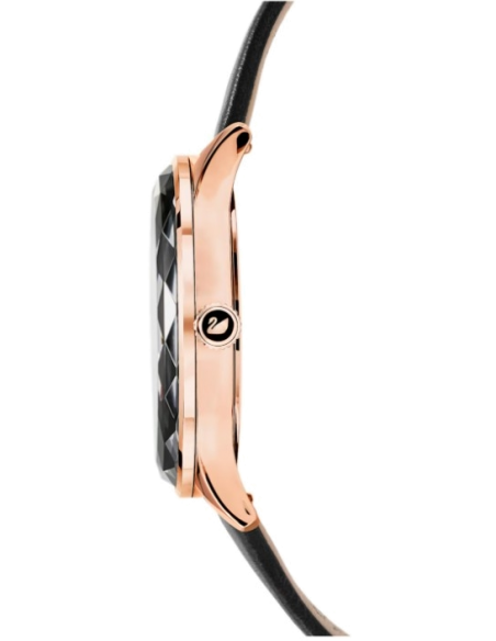 Swarovski watch NEW with original Swarovski guarantee, Octea collection, this watch achieves the perfect balance between light and dark tones and combines a black color with a rose gold finish. At the front, the ingenious bezel and face are crafted from a single sapphire crystal with 72 facets, while the black guilloche dial features crystals for hour markers and a graceful swan motif at 12 o'clock. Switzerland contributes water resistance to 50m and an Italian calfskin strap with an embossed lizard motif. Wear this elegant timepiece to spice up your style.