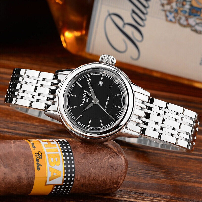 Stainless steel case with a stainless steel bracelet. Fixed stainless steel bezel. Black dial with silver-tone hands and index hour markers. Minute markers around the outer rim. Dial Type: Analog. Date display at the 3 o'clock position. Self winding automatic movement with a 38-hour power reserve. Scratch resistant sapphire crystal. Skeleton case back. Case diameter: 29.5 mm. Case thickness: 9.15 mm. Round case shape. Band width: 14 mm. Fold over clasp. Water resistant at 30 meters / 100 feet. Functions: date, hour, minute, second. Casual watch style. Tissot Carson Automatic Black Dial Stainless Steel Ladies Watch T0852071105100.Stainless steel 316L, the material used in this watch, is incredibly tough and long-lasting. It's resistant to bending, cracking, and discoloration, making it perfect for daily wear. Not only is it hypoallergenic and won't irritate your skin, but it also has a protective surface that won't rust or corrode in water.