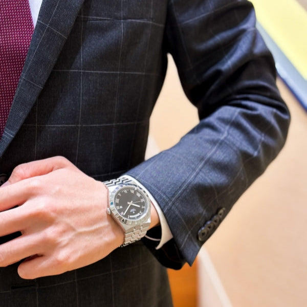 - Black sunray-finish dial with stainless steel hands and applied Roman numeral hour markers