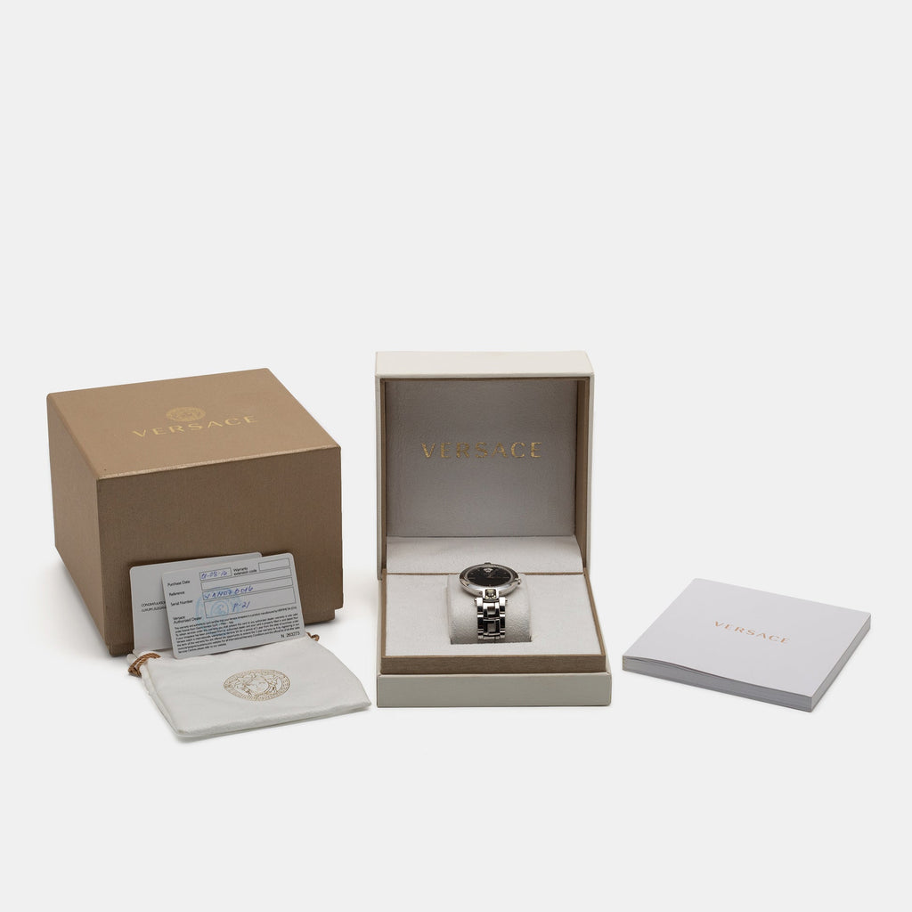Stainless steel case with a stainless steel bracelet. Fixed stainless steel bezel. Crystal-set lugs. Black guilloche (medusa head) dial with silver-tone skeleton hands and index hour markers. The Versace Medusa logo appears at the 12 o'clock position. Quartz movement. Scratch resistant sapphire crystal. Pull / push crown. Solid case back. Case size: 37 mm. Case thickness: 8 mm. Round case shape. Band width: 18 mm. Deployment clasp with a push button release. Water resistant at 30 meters / 100 feet. Functions: hour, minute. Dress watch style. Versace Crystal Gleam Black Guilloche Dial Ladies Watch VAN030016.| Brand | Versace |