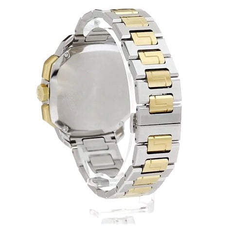 Stainless steel case with a two-tone (silver and gold ion-plated) stainless steel bracelet. Fixed gold ion-plated bezel showing tachymeter markings. Black dial with gold-tone hands and index and Arabic numeral hour markers. Minute markers around the outer rim. The Versace Medusa logo appears at the 12 o'clock position. Dial Type: Analog. Luminescent hands and markers. Date display at the 6 o'clock position. Chronograph - three sub-dials displaying: 60 second, 30 minute and 1/10th of a second. Quartz movement. Scratch resistant sapphire crystal. Pull / push crown. Solid case back. Case size: 44 mm. Case thickness: 12 mm. Octagon case shape. Band width: 20 mm. Deployment clasp with a push button release. Water resistant at 50 meters / 165 feet. Functions: chronograph, tachymeter, luminous, date, hour, minute, second. Dress watch style. Watch label: Swiss Made. Versace Dylos Chronograph Black Dial Men's Watch VQC100016.