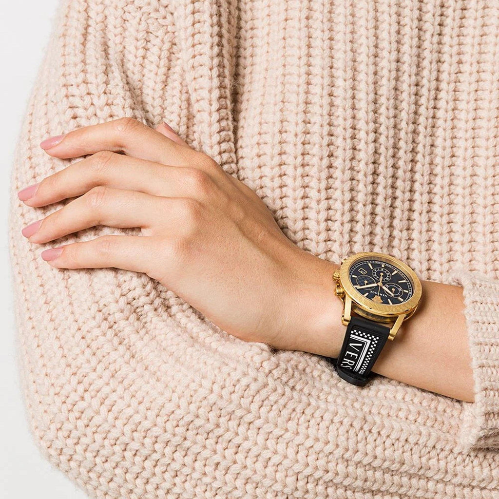 Black Dial. Gold Plated Hour Markers, Luminous Hands. IP Gold Sub-Dials with a 12 Hour counter at 6 O'Clock, 30 Minute Counter at 9 O'Clock and Green Small Seconds at 3 O'Clock. Date Window at 4 O'Clock. IP Gold Medusa Head at 12 O'Clock
