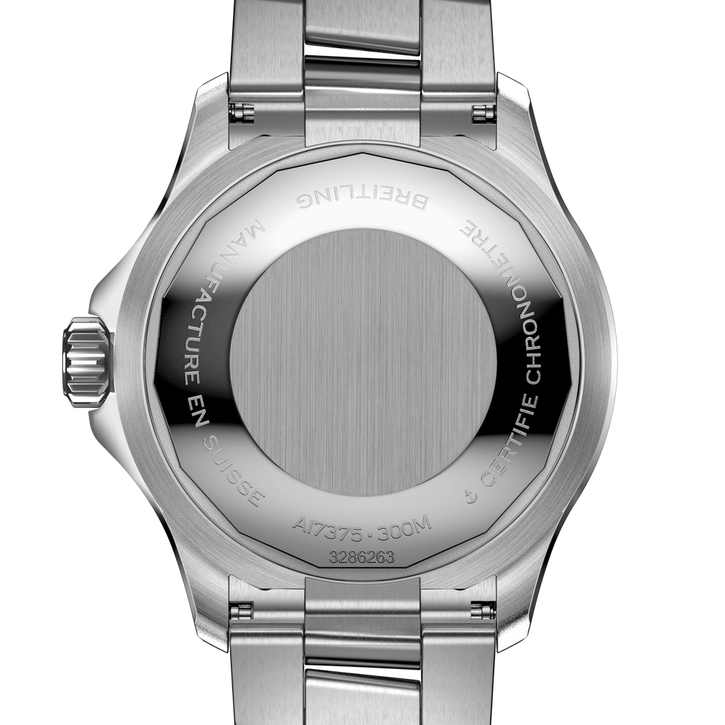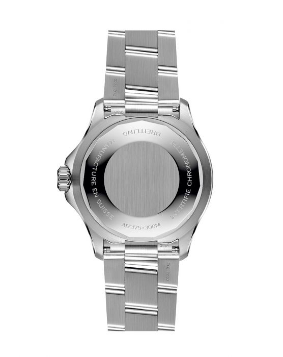 The Breitling A17375E71C1A1 watch combines a 42mm round shaped stainless steel case and silver stainless steel bracelet with a fold over clasp. It has a blue analogue dial with Super-LumiNova coated hands which is protected beneath anti-reflective coated scratch resistant sapphire crystal glass. Power is generated by the automatic movement with a 38 hour power reserve. Watch is also shock, sand and saltwater-resistant. This model also has a water resistance of up to 300 metres.