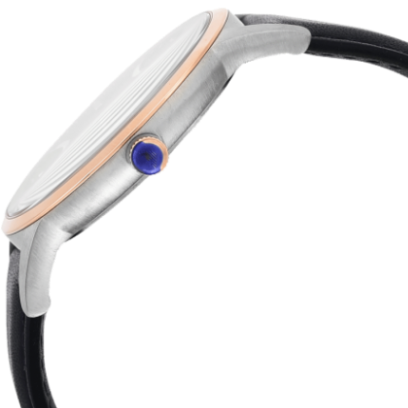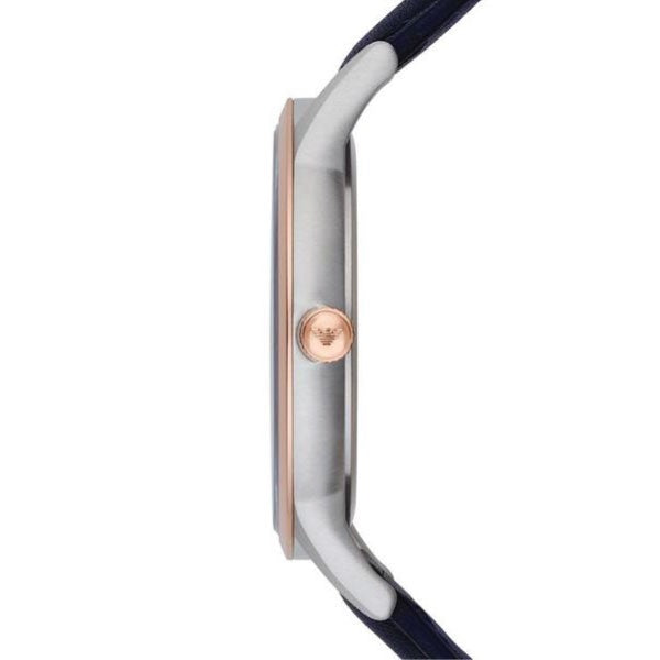 This Emporio Armani watch features a blue sunray dial with a date window, accented by a rose gold-tone top-ring and blue leather strap. Tough and to the point, this watch blends the best of style and utility. A blue leather strap completes the look. The leather strap perfectly juxtaposes masculine roughness with the gentlemanly class of the timepiece.
