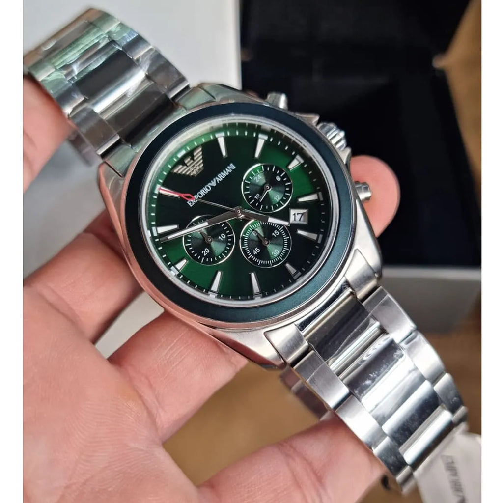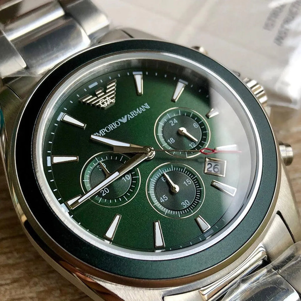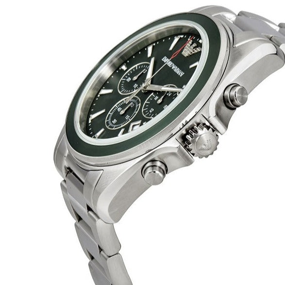 Silver-tone stainless steel case with an emerald green dial and silver stainless steel bracelet. This watch is shipped with its original box and official warranty.