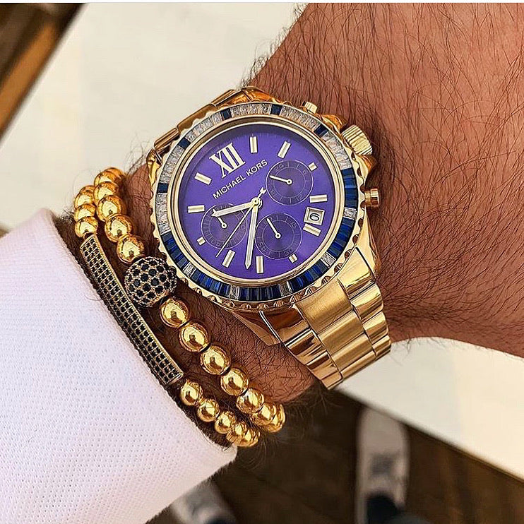 Gold-tone stainless steel case and bracelet. Fixed gold-tone bezel set with clear and navy baguette crystals. Navy dial with gold-tone hands and index hour markers. Roman numeral marks the 12 o'clock position. Minute markers around the outer rim. Dial Type: Analog. Luminescent hands and markers. Date display between 4 and 5 o'clock positions. Chronograph - three sub-dials displaying: 60 second, 60 minute and 24 hour. Quartz movement. Scratch resistant mineral crystal. Solid case back. Case diameter: 42 mm. Case thickness: 10 mm. Round case shape. Band width: 18 mm. Deployment clasp. Water resistant at 100 meters / 330 feet. Casual watch style. Michael Kors Everest Chronograph Navy Dial Gold-tone Watch MK5754