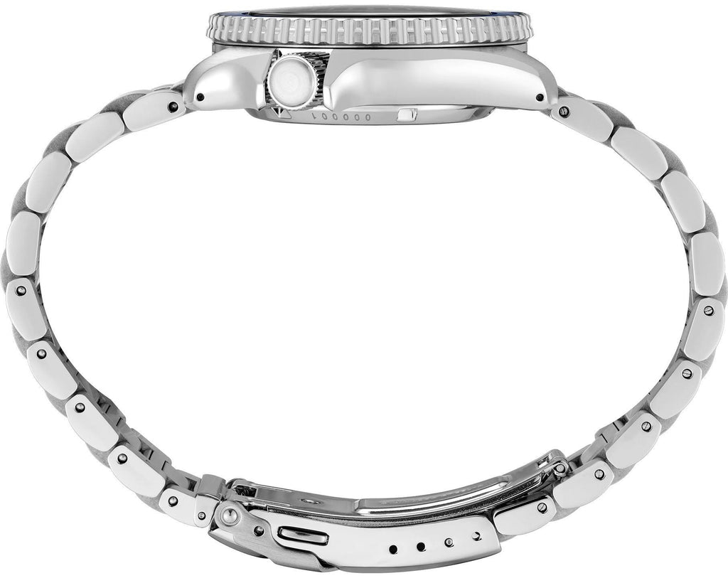 Silver-tone stainless steel case and bracelet. Uni-directional rotating blue stainless steel bezel. Blue dial with silver-tone hands and index hour markers. Minute markers around the outer rim. Dial Type: Analog. Luminescent hands and markers. Day of the week and date display at the 3 o'clock position. Seiko Caliber 4R36 Automatic movement, containing 24 Jewels, bitting at 21600 vph, and has a power reserve of approximately 41 hours. Scratch resistant Hardlex crystal.
