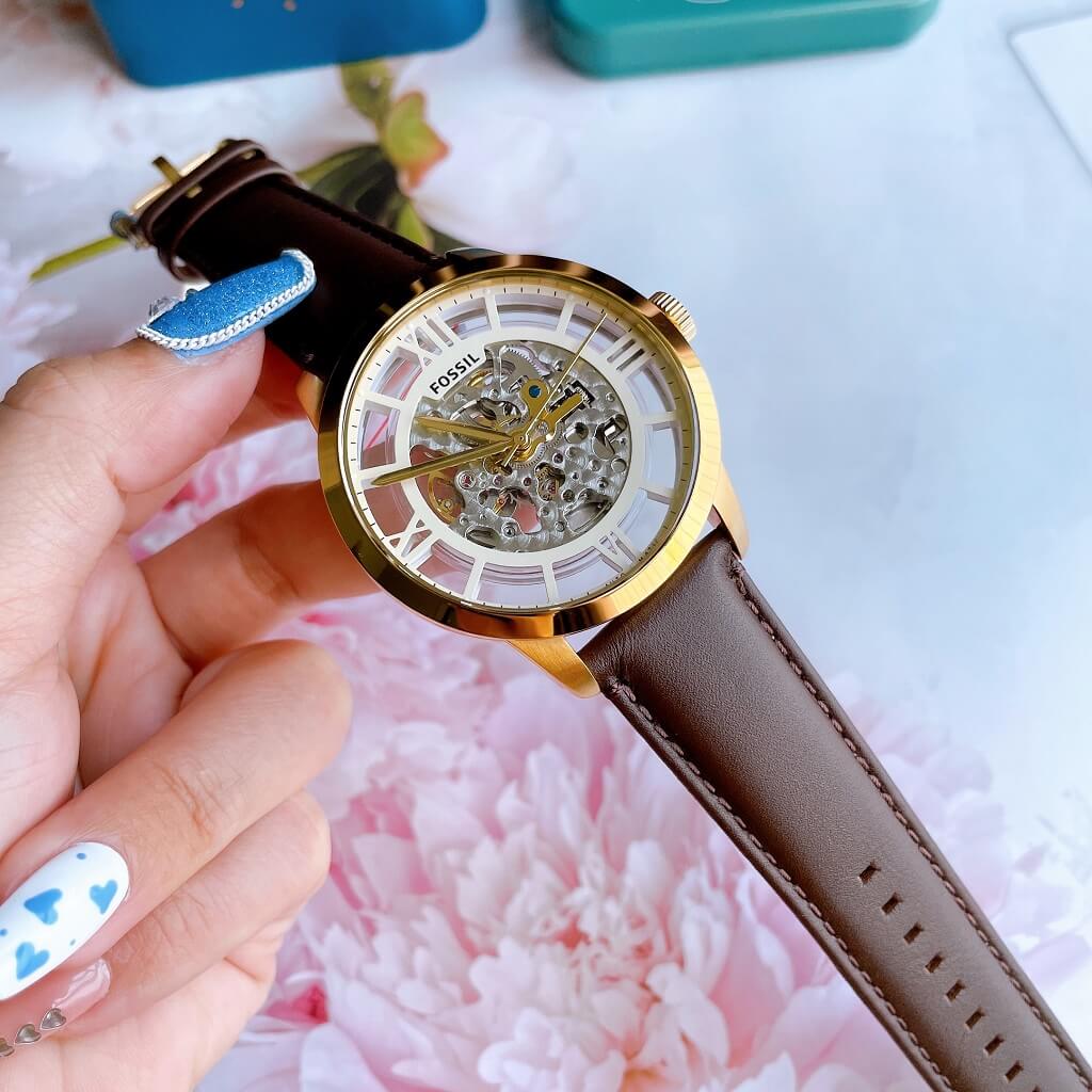 Fossil Townsman Automatic Skeleton Gold Dial Brown Leather Strap Watch for Men - ME3043