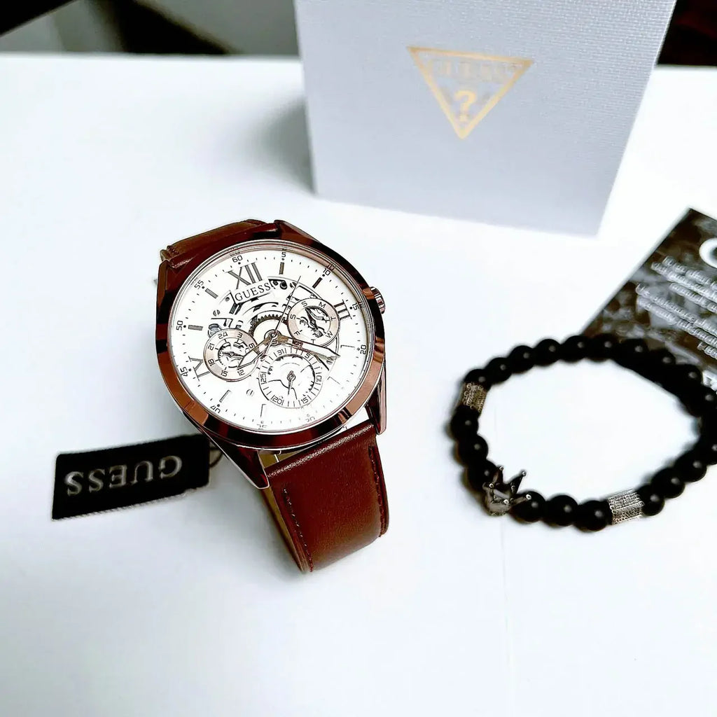 Guess Multi-Function Chronograph White Dial Brown Leather Strap Watch For Men - GW0389G8