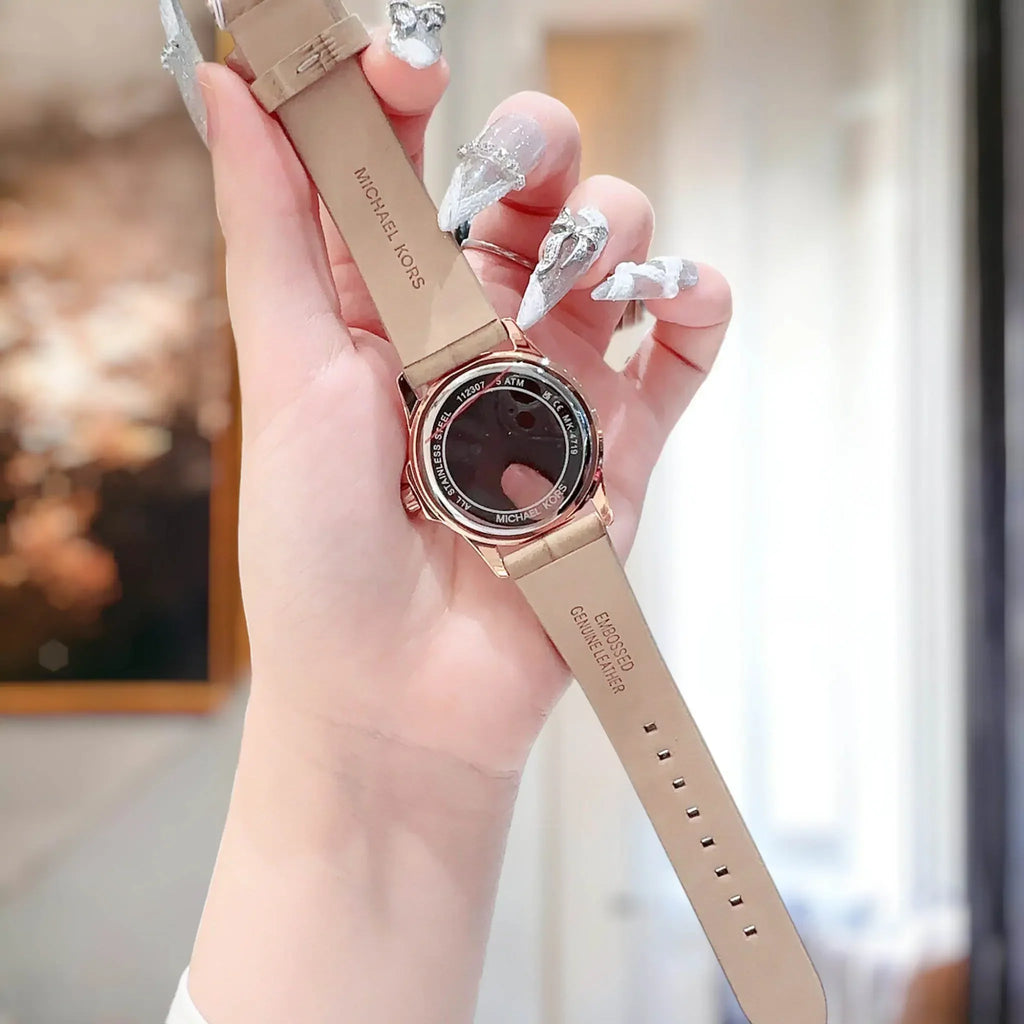 Michael Kors MINI EVEREST watch featuring a 33mm case with a three-hand movement. White sunray dial with pave sparkle and luggage leather croco suede strap