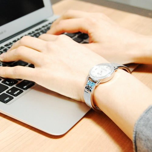 Coach Delancey Silver Dial Stainless Steel Ladies Watch 14502353. 28 mm silver tone stainless steel case with crystals around the bezel. A silver dial with a mineral crystal. Silver tone luminous hands. Crystal hour markers with Arabic numerals at the 12, 3, 6, and 9 o'clock positions. Minute markers around the outer rim. Hands: hours, minutes, and seconds. Case thickness of 8 mm. Push / pull crown. 14 mm silver tone stainless steel bracelet with signature Cs logo. Jewelry clasp. Quartz movement and water resistant up to 30 meters. Style: dress watches.
