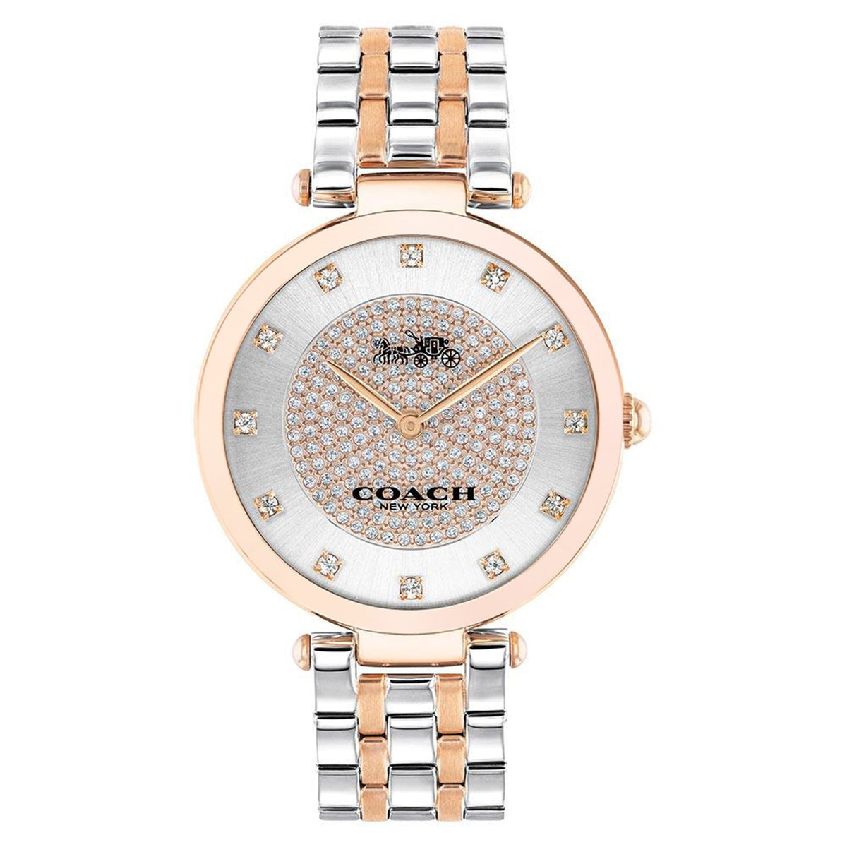 Rose gold-tone stainless steel case with a two-tone (silver-tone and rose gold-tone) stainless steel bracelet. Fixed rose gold-tone bezel. Silver (crystal pave center) dial with rose gold-tone hands and crystal hour markers. Dial Type: Analog. Quartz movement. Scratch resistant mineral crystal.