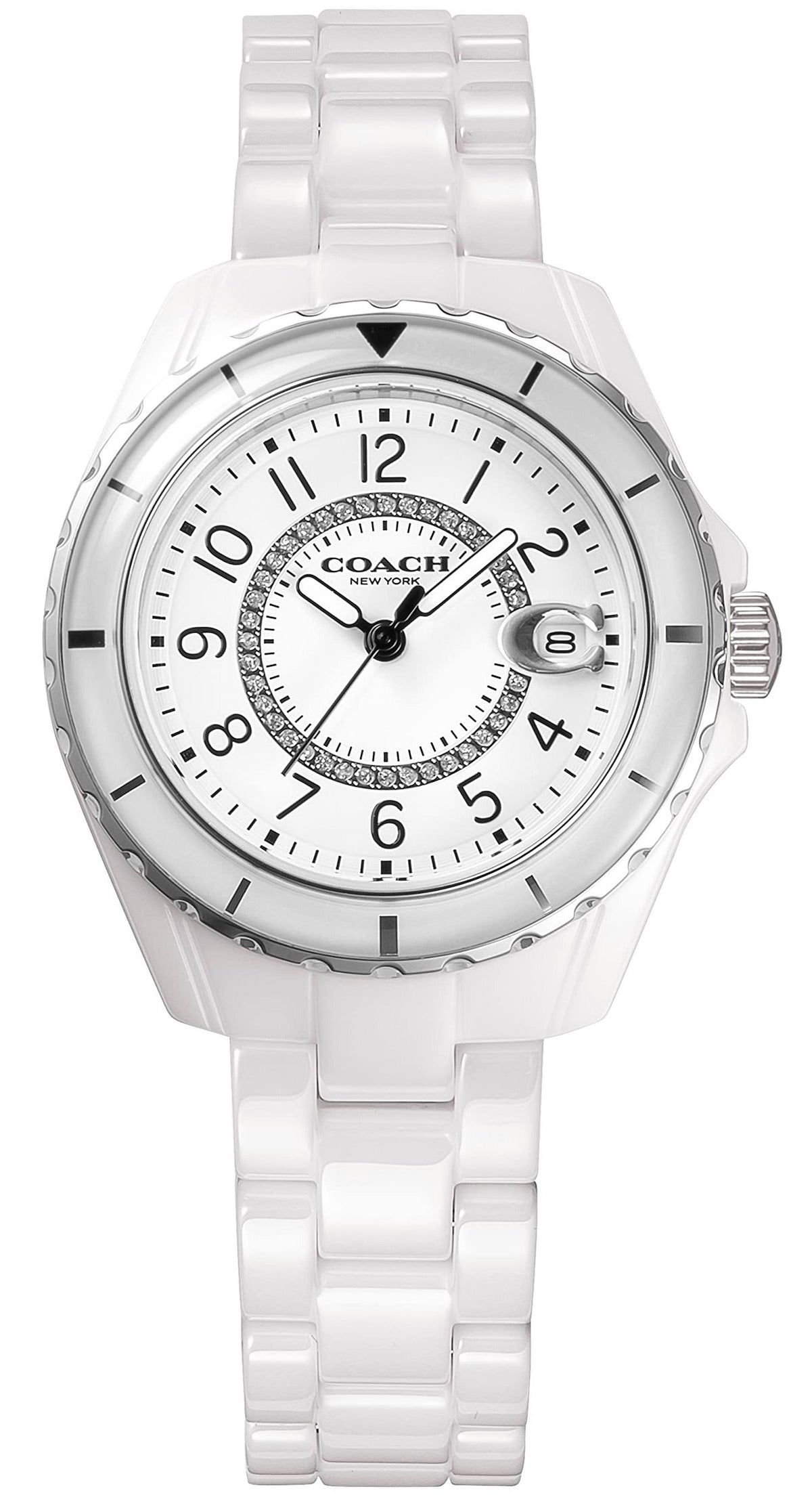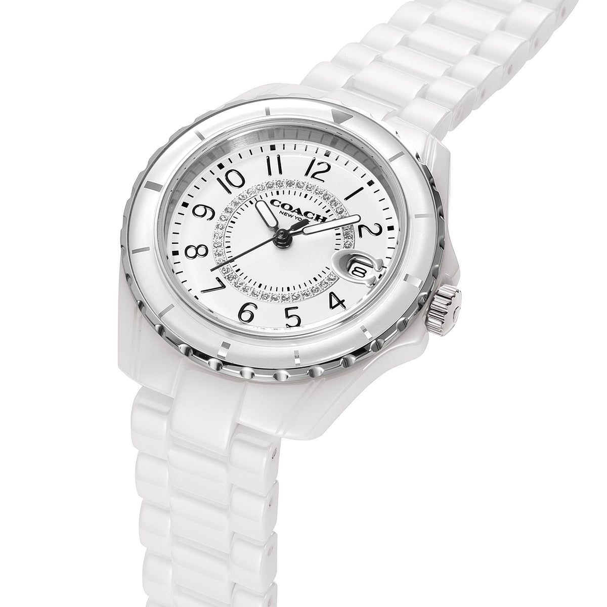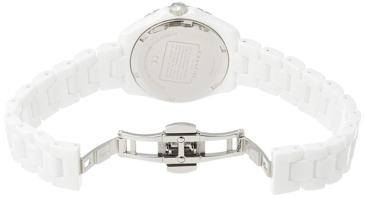 Undeniably eye-catching, this Preston women's watch from Coach is a chic timepiece adding distinction to any look. A bold 32mm white ceramic caseback is adorned with gold accents while the white dial features silver-tone concentric rings culminating in a row of ornate Swarovski® crystals. Features include a date display, luminescent hands and water resistance to 30 meters. The white ceramic bracelet secures with a push-button deployment clasp.