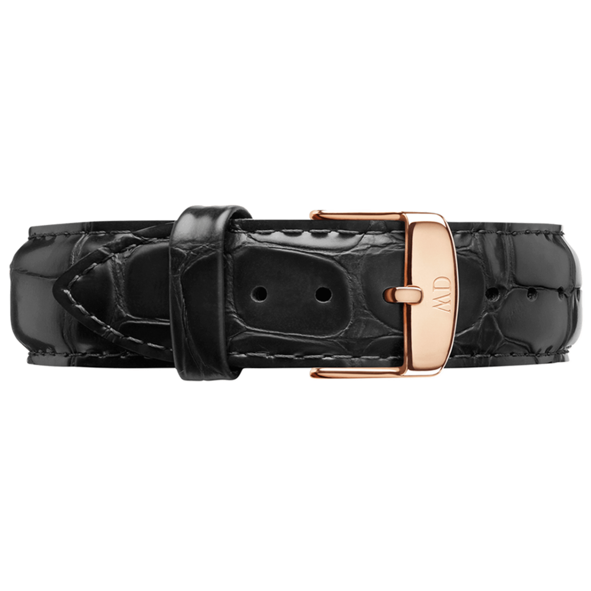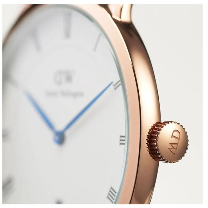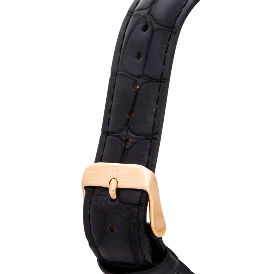 Rose gold-tone stainless steel case with a leather strap. Fixed rose gold-tone bezel. Eggshell white dial with blue hands and Roman numeral hour markers. Dial Type: Analog. Date display above the 6 o'clock position. Quartz movement. Scratch resistant sapphire crystal. Pull / push crown. Solid case back. Case size: 38 mm. Case thickness: 7 mm. Round case shape. Band width: 22.5 mm. Tang clasp. Water resistant at 30 meters / 100 feet. Functions: date, hour, minute. Casual watch style. Daniel Wellington Dapper Reading White Dial Men's Watch DW00100107.