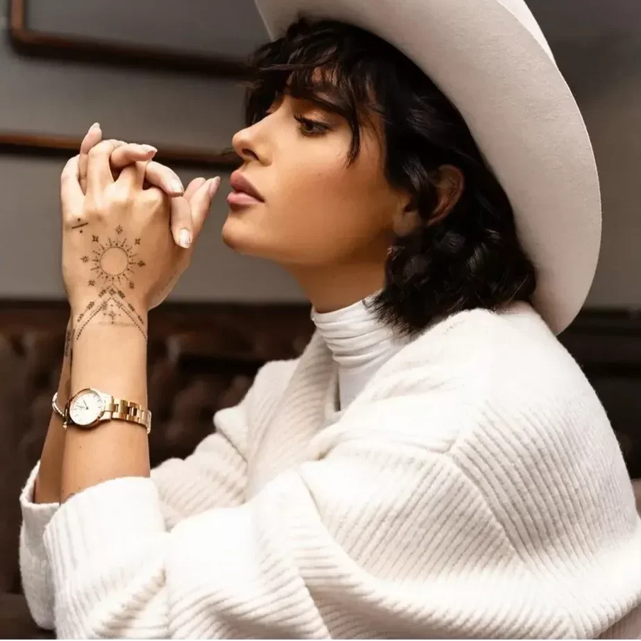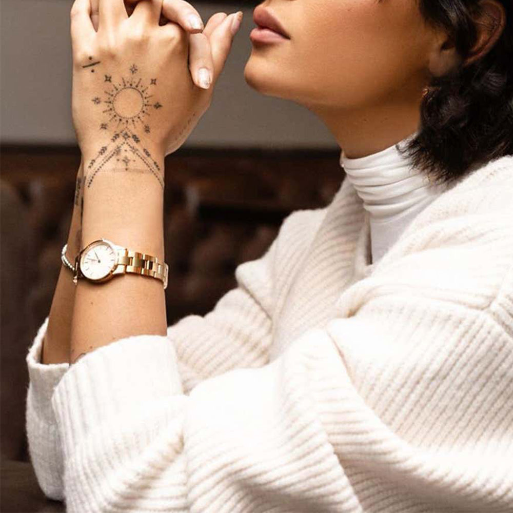 Rose gold-tone stainless steel case and bracelet. Fixed rose gold-tone stainless steel bezel. White dial with rose gold-tone hands and index hour markers. Dial Type: Analog. Quartz movement. Scratch resistant mineral crystal. Pull / push crown. Round case shape, case size: 28 mm, case thickness: 8 mm. Band width: 14 mm. Deployment with push button release clasp. Water resistant at 30 meters / 100 feet. Functions: hour, minute. Iconic Link Series. Casual watch style. Watch label: Japan Movt. Daniel Wellington Iconic Link Quartz White Dial Ladies Watch DW00100213.