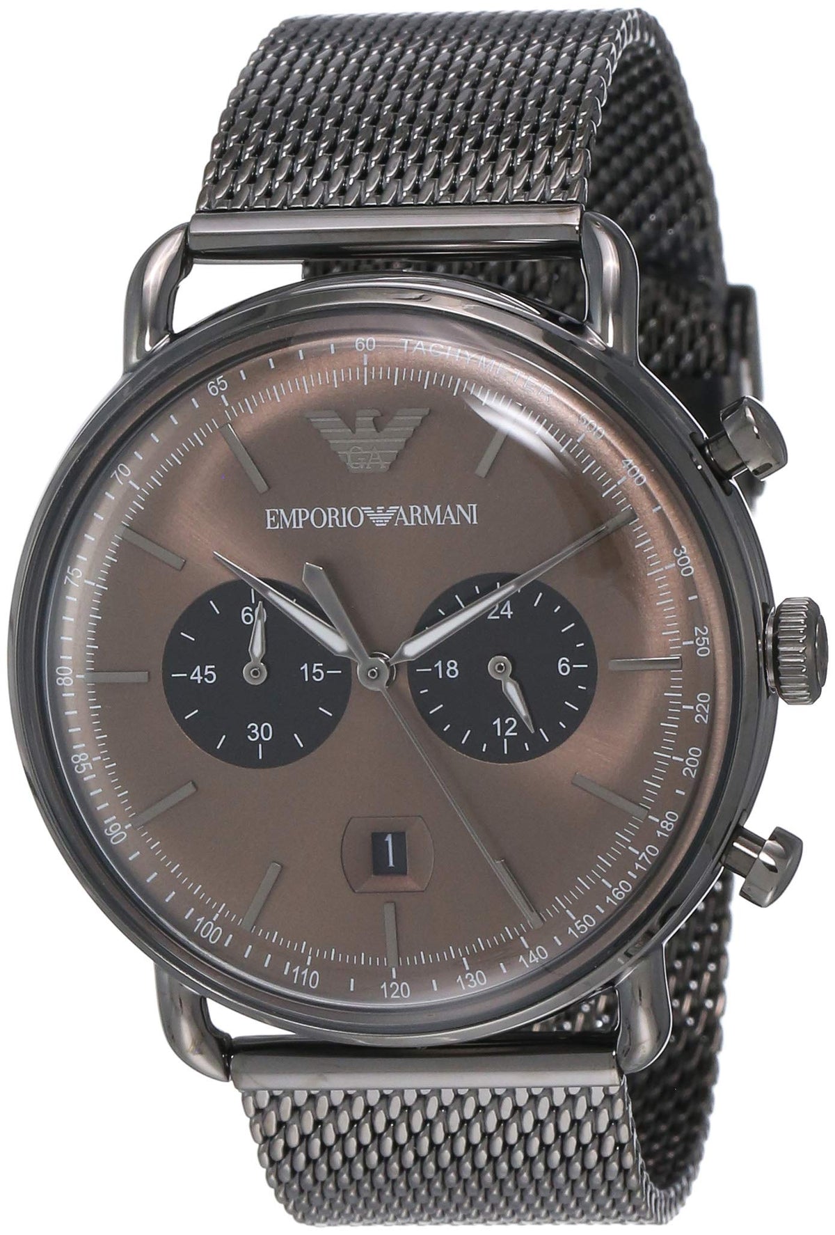 This Emporio Armani Aviator Chronograph Brown Dial Men's Watch AR11141 comes in bronze stainless steel case with a bronze stainless steel mesh bracelet. Fixed bronze stainless steel bezel. Brown dial with silver-tone hands and index hour markers. Tachometer scale around the outer rim. Dial Type: Analog. Luminescent hands. Date display at the 6 o'clock position. Chronograph - sub-dials displaying: two - 60 second and 24 hour. Quartz movement. Scratch resistant mineral crystal. Pull / push crown. Solid case back. Round case shape, case size: 43 mm, case thickness: 12 mm. Band width: 22 mm. Fold over with safety release clasp. Water resistant at 50 meters / 165 feet. Functions: chronograph, date, hour, minute, second, 24 hour. Casual watch style. Watch label: Japan Movt.