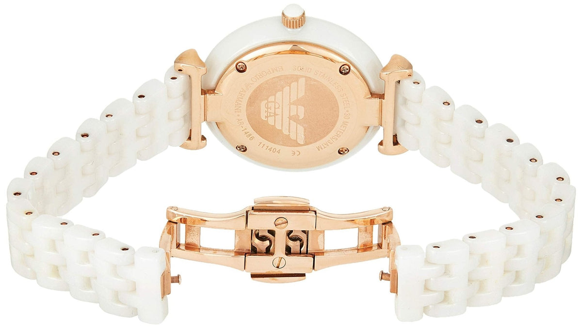 White ceramic case with a white ceramic bracelet. Fixed white ceramic bezel. Mother of pearl dial with rose gold-tone hands and index-Roman numerals hour markers. Dial Type: Analog. Quartz movement. Solid case back. Case size: 32 mm. Case thickness: 7.5 mm. Round case shape. Band width: 14 mm. Water resistant at 30 meters / 100 feet. Functions: hour, minute. Dress watch style. Emporio Armani Ceramica Mother of Pearl Ladies Watch AR1486.