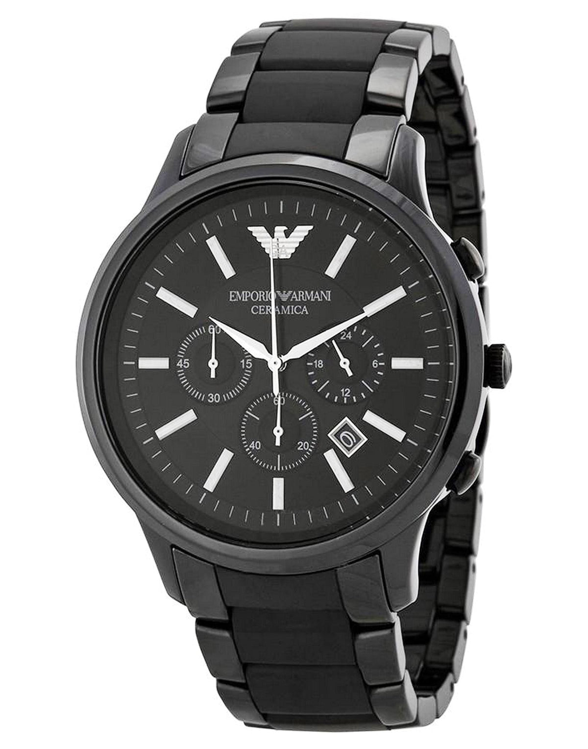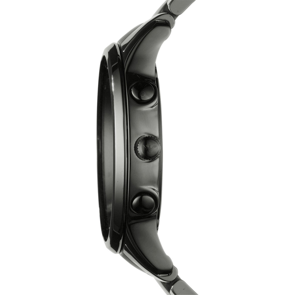 Black ceramic case with a black ceramic bracelet. Fixed black ceramic bezel. Black dial with luminous silver-tone alpha-style shape hands and index hour markers. Emporio armani logo marks the 12 o'clock position. minute markers around the outer rim. Dial Type: Analog. Luminescent hands and markers. Date display between the 4 and 5 o'clock positions. Chronograph - three sub-dials displaying: 60 second, 60 minute and 24 hour. Quartz movement.