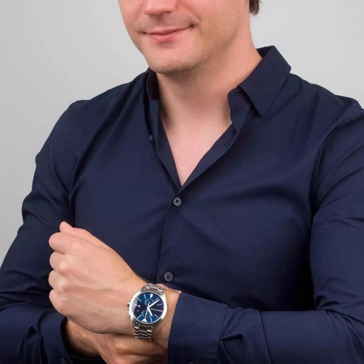 Emporio Armani's 43mm watch features a blue sunray dial, chronograph movement and stainless steel bracelet.