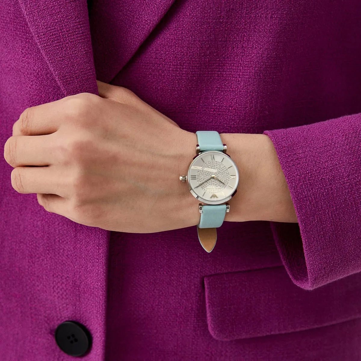 Amaze everyone around you by wearing this women's analog watch from Emporio Armani. The silver round dial is protected by a mineral glass. It features plain 2-hand, and a crown for time adjustment.