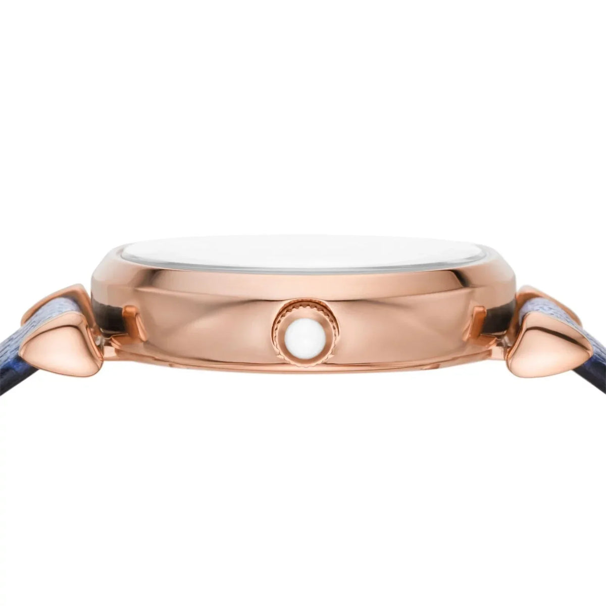Sku: AR11468 Case Size: 28 mm Movement: Quartz Two-Hand Platform: NA Strap Material: Leather Strap Colour: Blue Case Water Resistance: 3 ATM Case Material: Stainless Steel Case Colour: Rose Gold Dial Colour: Mother-Of-Pearl, White Strap Width: 12 mm Closure: Strap Deployant Strap Inner Circumference: 175 +/- 5 mm Crystal Type: Mineral Battery Type: SR621SW
