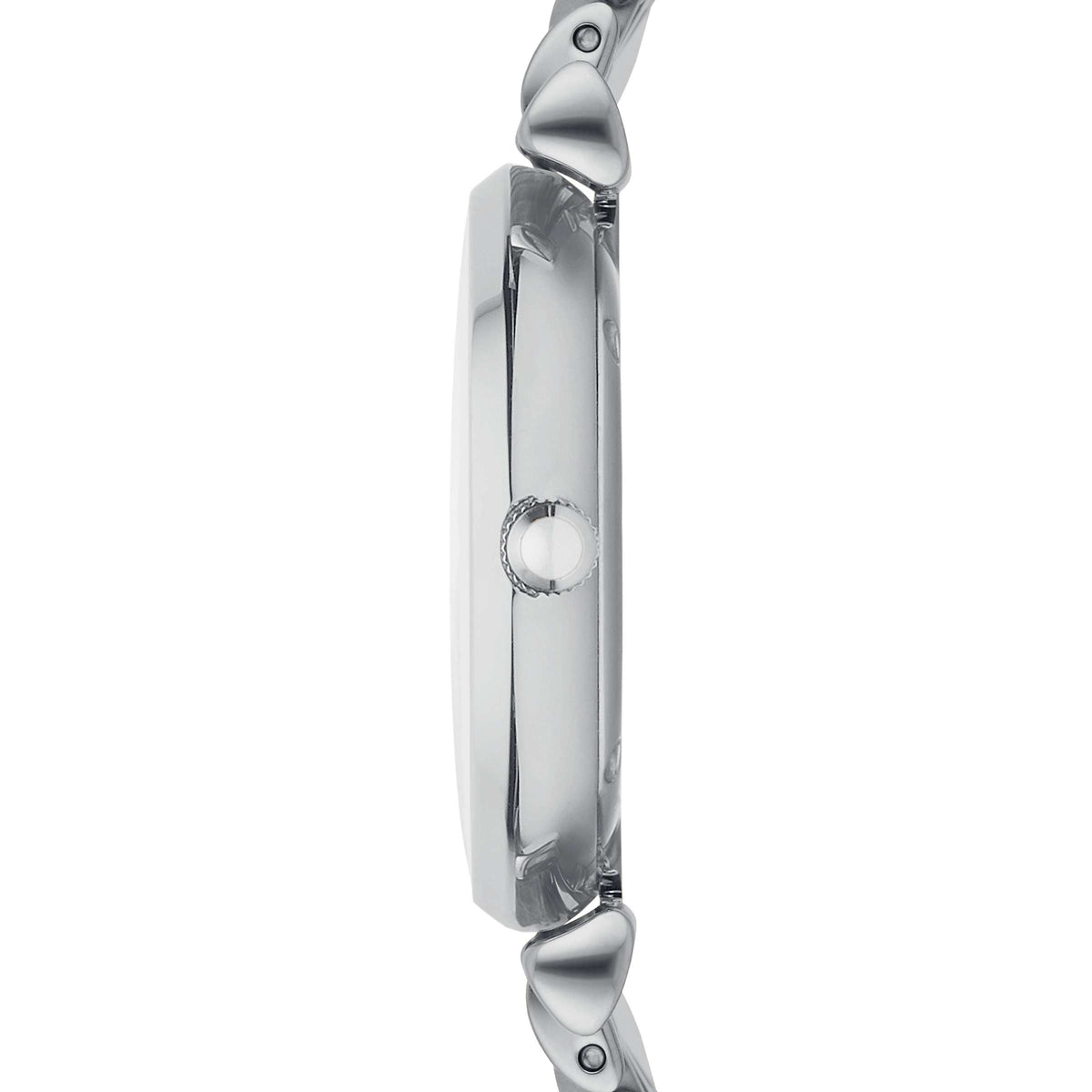 A gorgeous crystal-lined Mother of Pearl dial leaps from the classic silver band of this stunning ladies' timepiece from Emporio Armani's Gianni T-Bar collection.