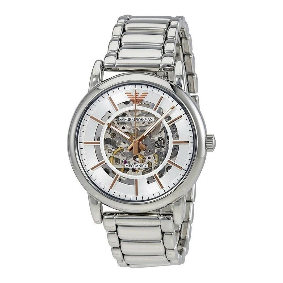 Emporio Armani Meccanico Skeleton Silver Dial Silver Steel Strap Watch For Men - AR1980